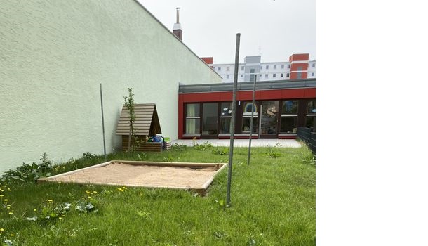 Die Krippengruppe verfügt über einen eigenen Außenbereich mit großem Sandkasten, Nestschaukel, Häuschen usw.